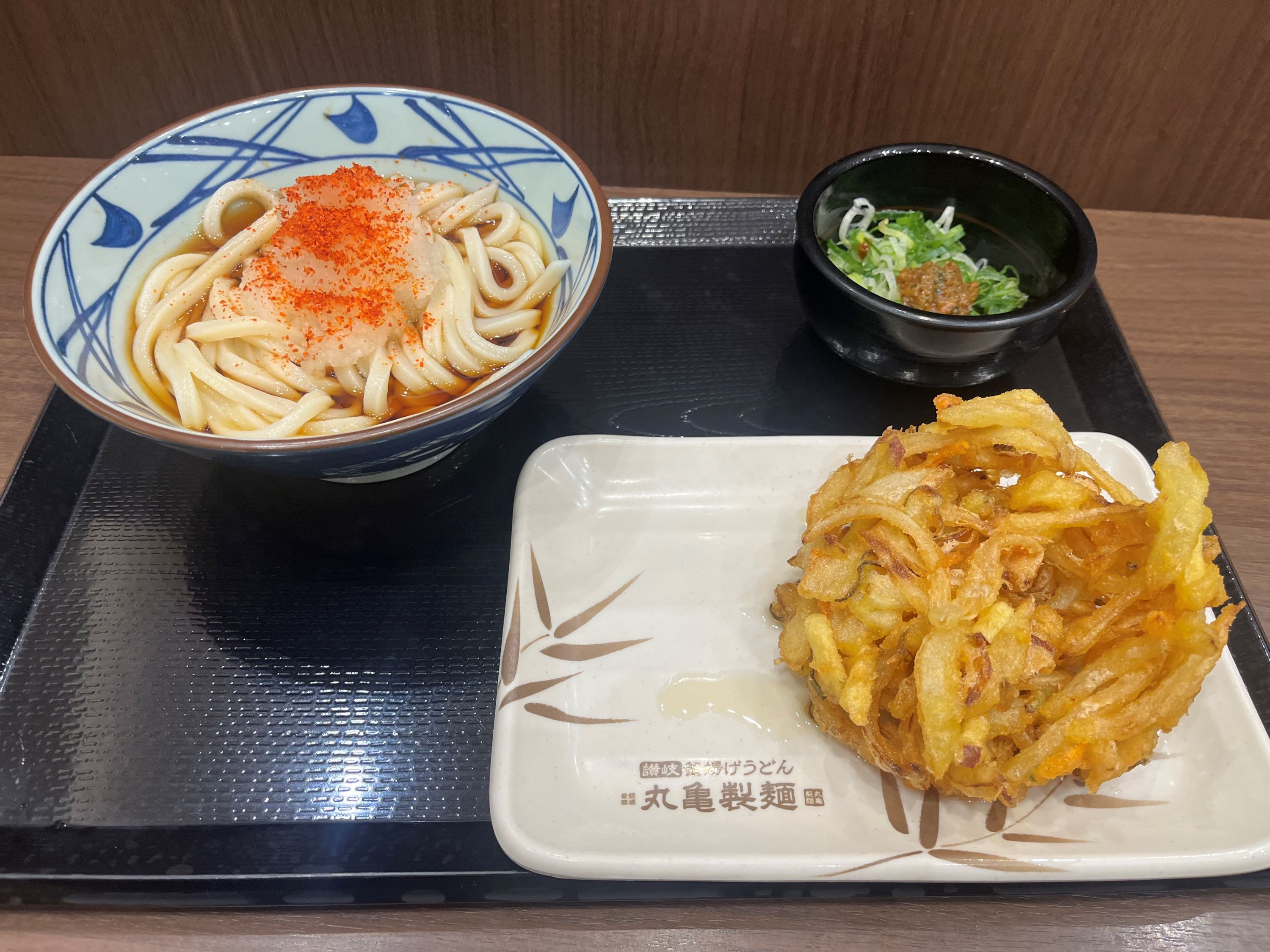 冷たいぶっかけうどんに大根おろし!辛いのお好きな方は、特製七味と特製ラー油も一緒に!