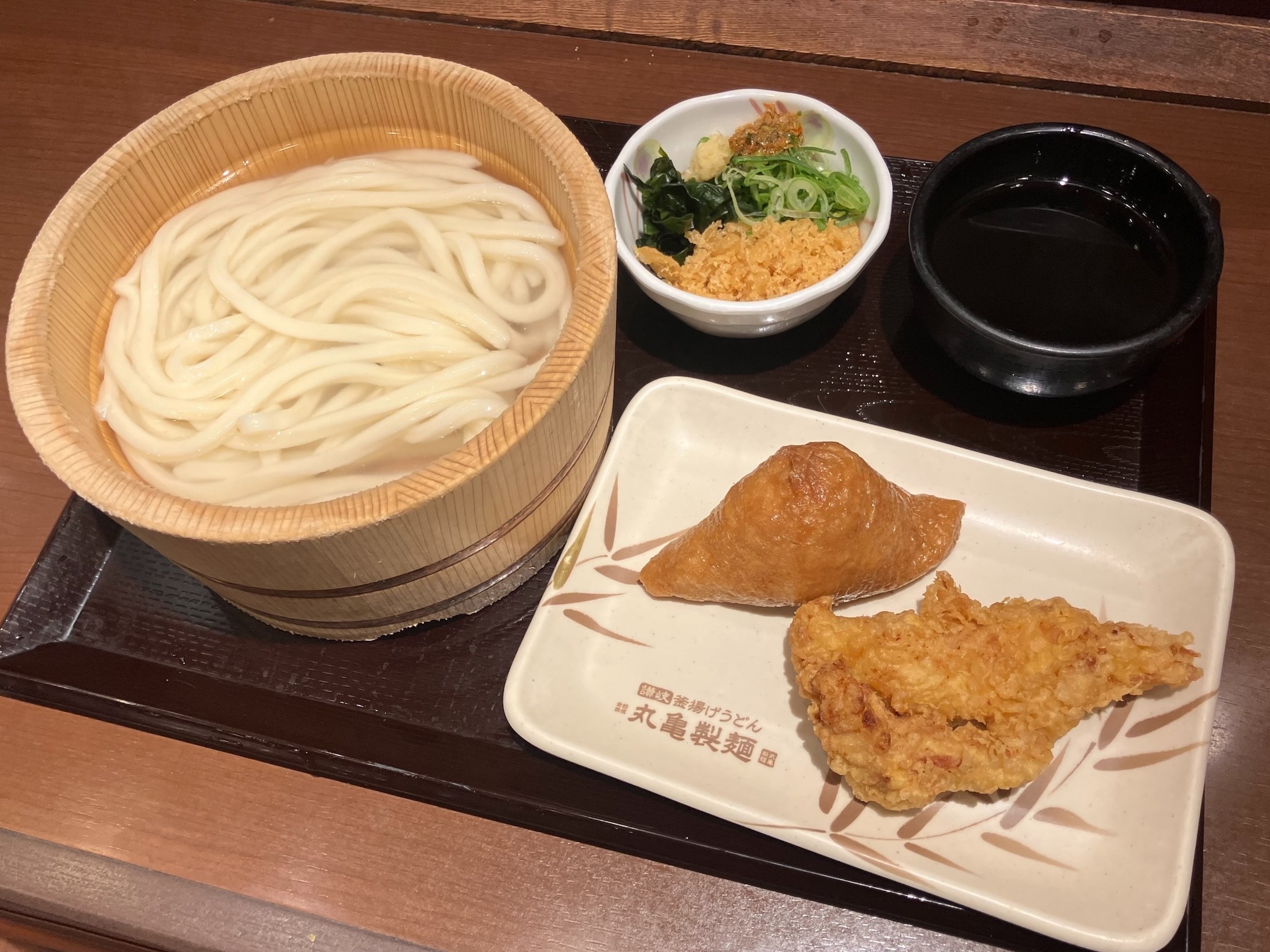 丸亀製麺の王道 釜揚げうどん!天ぷらの一番人気 かしわ天!〆でもよし!最初に食べてもよし!おいなりさん!こんなに食べても120円!??